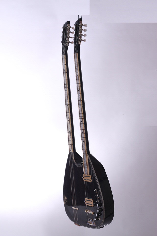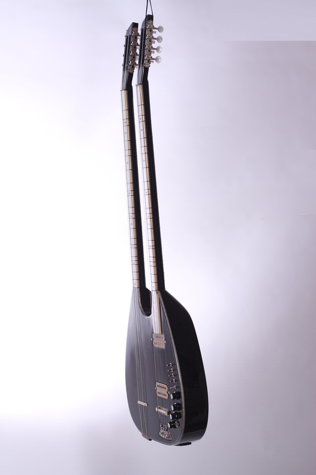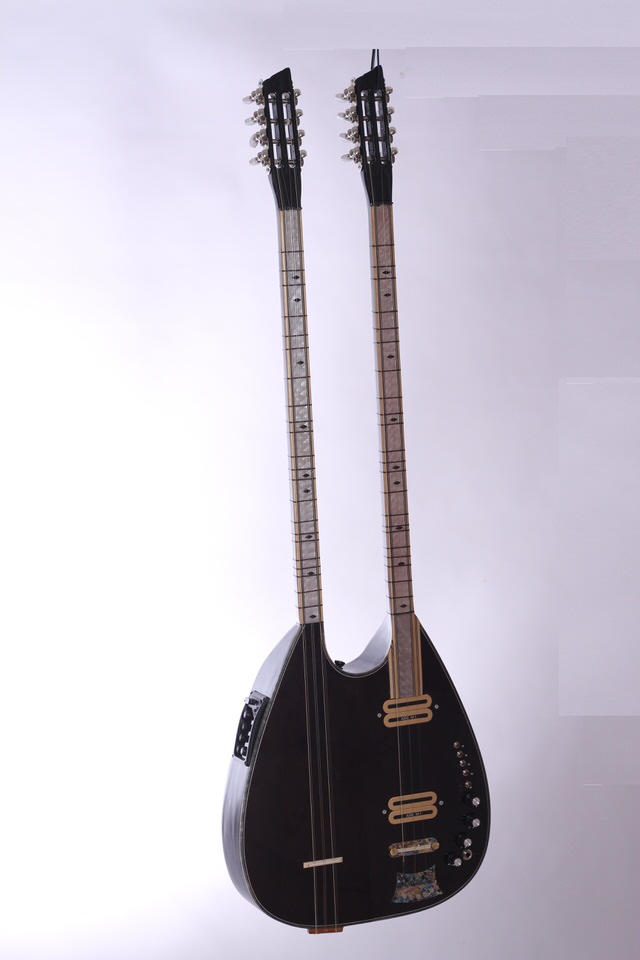 Dieses außergewöhnliche Modell verfügt über zwei Hälse (Doppelhals-System) und kombiniert sowohl elektrische als auch akustische Spielmöglichkeiten in einem Instrument. Dadurch bietet es maximale Flexibilität und eröffnet völlig neue kreative Möglichkeiten auf der Bühne.