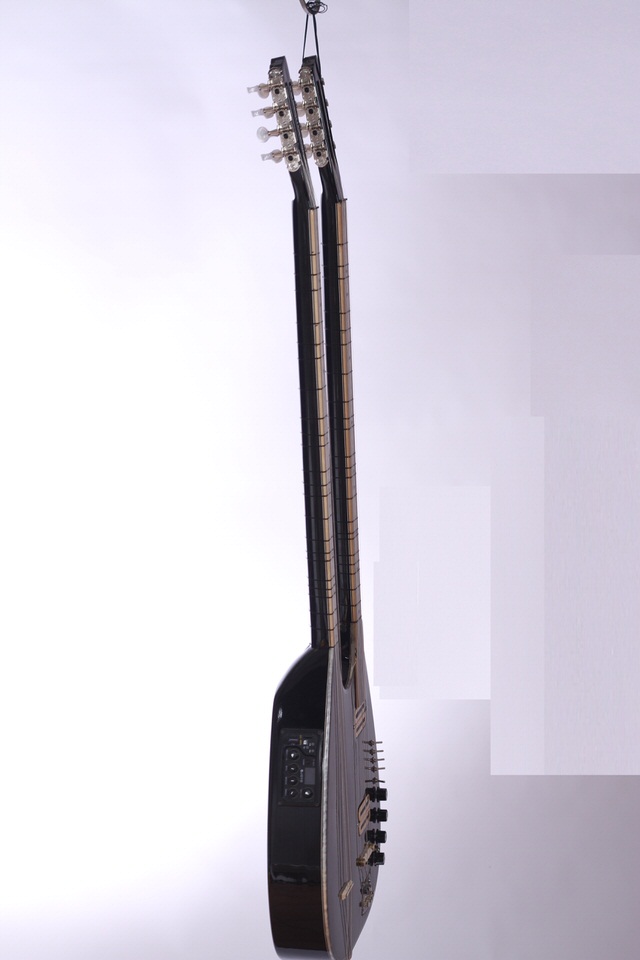 Die beiden Hälse aus Buche mit edlen Perlmutt-Einlagen bieten nicht nur eine außergewöhnliche Optik, sondern auch höchsten Spielkomfort. Mit insgesamt 23 + 23 Bünden und 5 + 7 Saiten (Pyramid Strings) ist dieses Instrument extrem vielseitig und ideal für komplexe musikalische Arrangements.